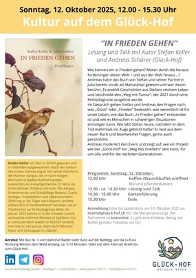 Auf Einladung des "Glück-Hofes" auf der Baldegg bei Baden führten wir im Oktober 2025 eine Buch-Präsentation mit Lesung und Gespräch durch. Moderiert vom Initianten des Hofes Andreas Schärer.